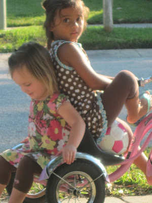 And these cute little girls. I must say they are doing and saying stuff to crack me up. Oh, oh and get this! Ella learned to ride a tricycle! She looks so cute! Here's some pics on one of the three riding contraptions we have lying around...